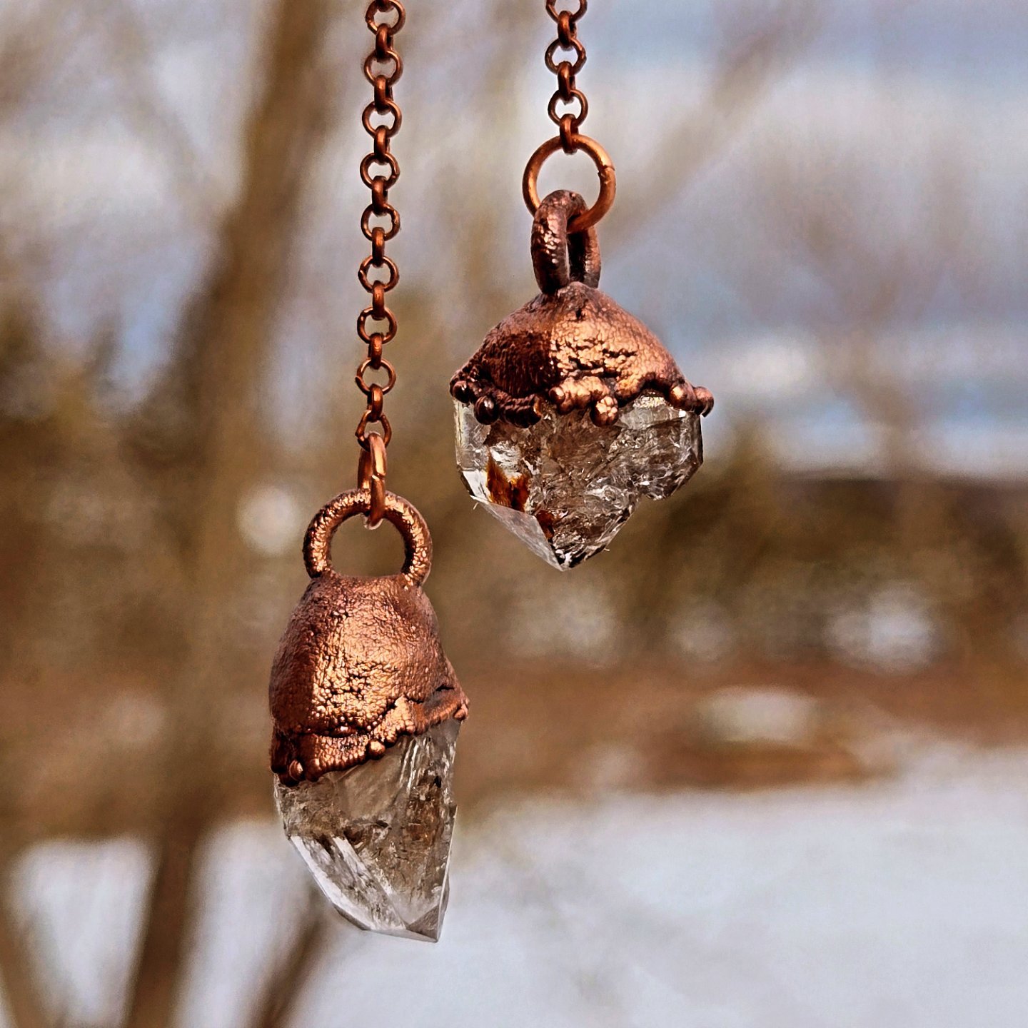 This copper electroformed Honeybee Amulet features a honeycomb-shaped moonstone and Herkimer diamonds, symbolizing harmony, clarity, and connection.