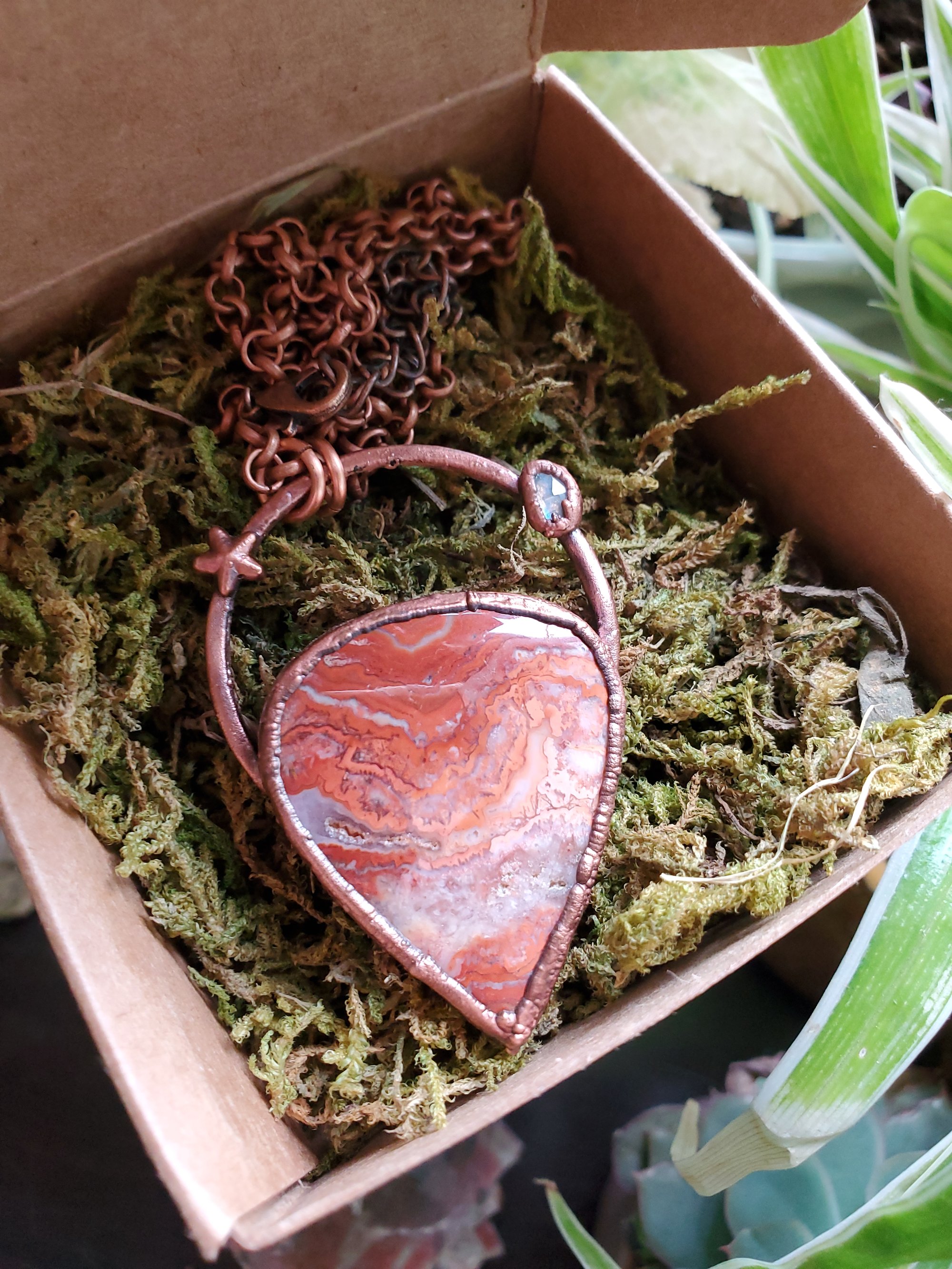 Introducing our newest creation: a mesmerizing handcrafted copper electroformed crazy lace Agate necklace! This stunning piece showcases the unique beauty of nature, with its intricate patterns and vibrant colors. Each agate stone is carefully selected and electroformed in copper, creating a one-of-a-kind pendant that's as enchanting as it is elegant. Whether you're looking to add a touch of boho chic to your outfit or seeking a statement piece that sparks conversation, this necklace is sure to captivate all eyes. Fall in love with the intricate details and organic charm of this wearable work of art. Dare to embrace your individuality and adorn yourself with a piece that reflects the wonders of the Earth.