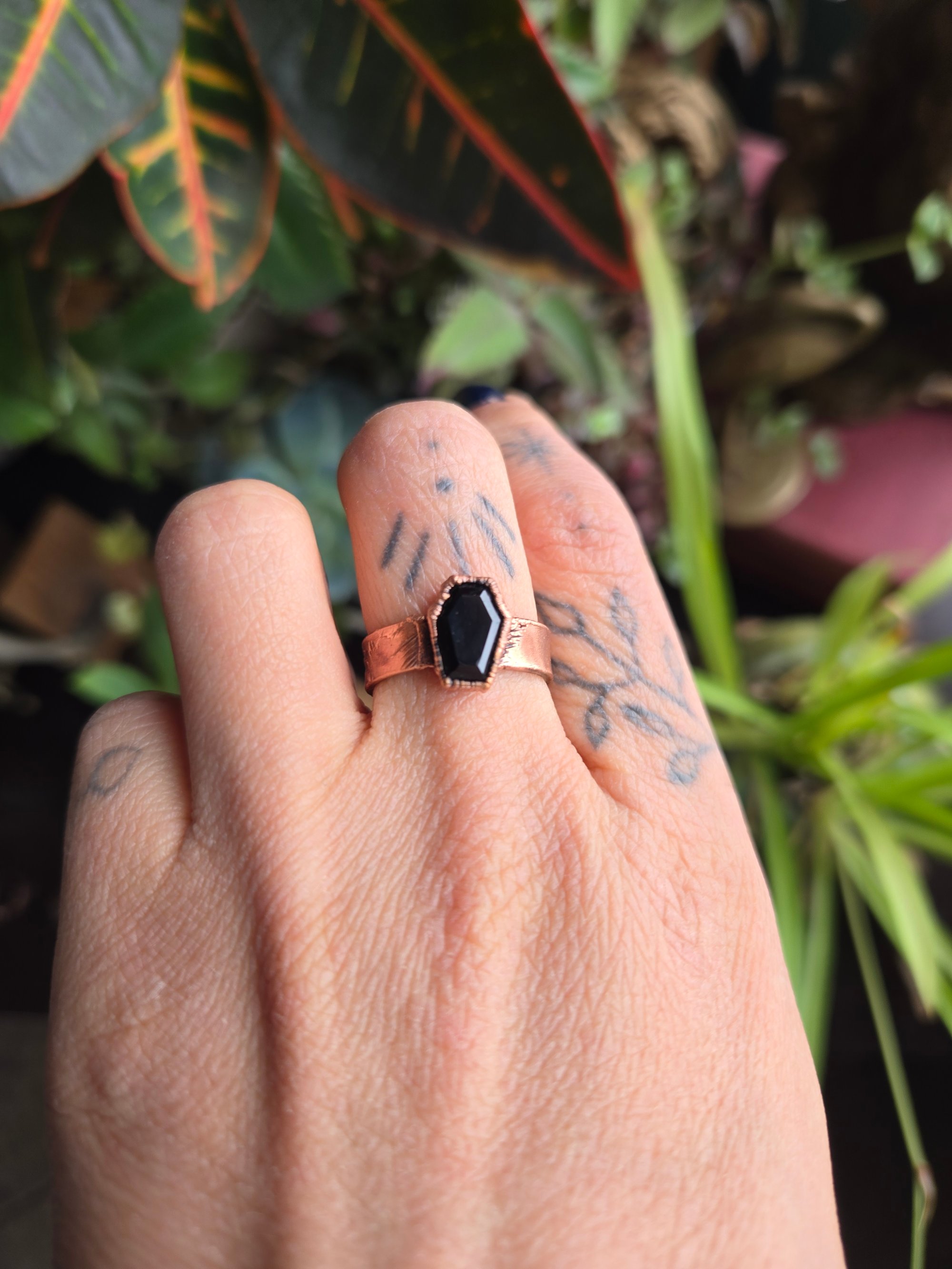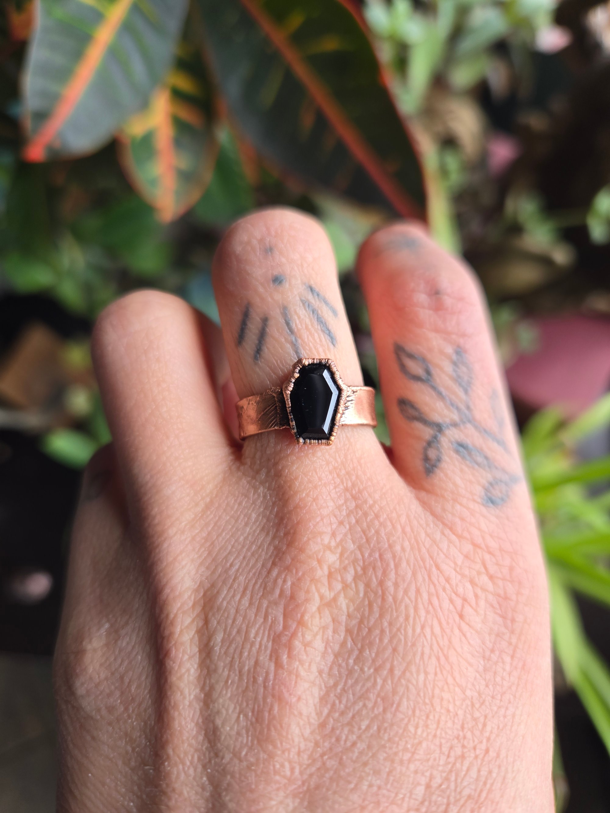 This copper-electroformed black onyx coffin ring is crafted to honour transformation.