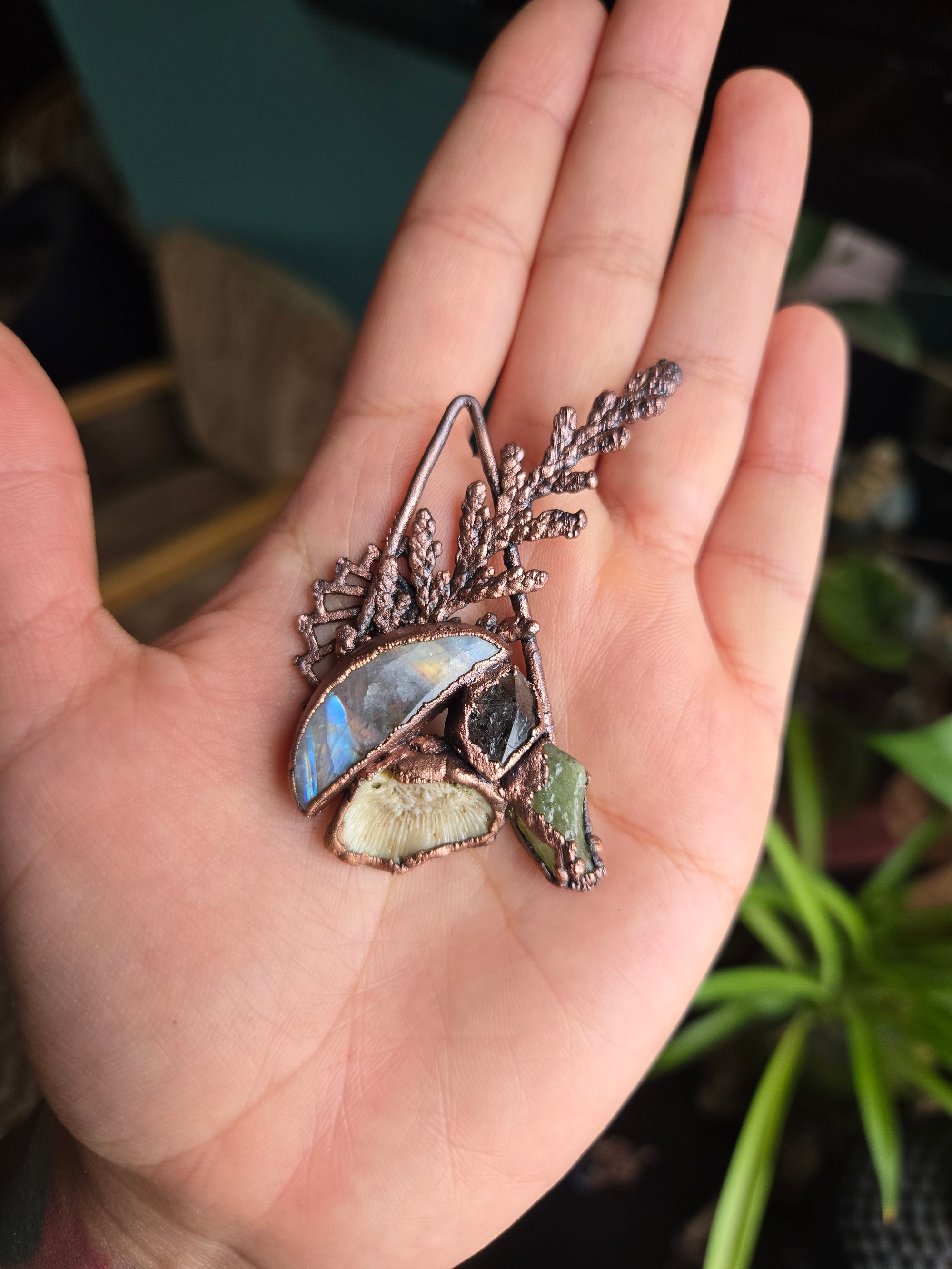 Each element has been electroformed in copper, enhancing the piece with a rustic, timeless finish. The pendant captures the harmony between natural beauty and intentional design, making it not just jewelry, but a wearable piece of art. Perfect for those who value the energy of gemstones and the allure of handmade creations, this pendant is a talisman of connection, protection, and growth.