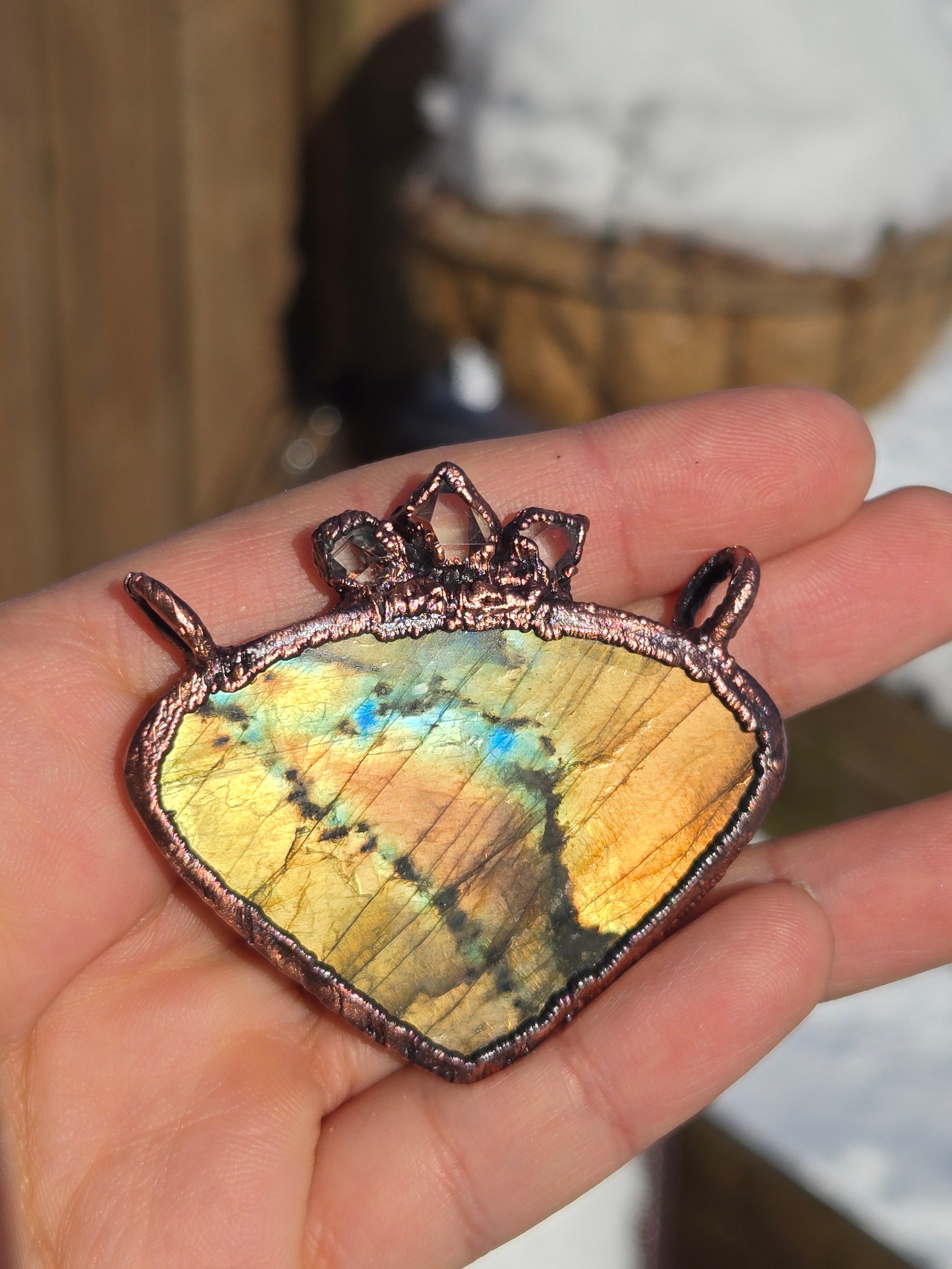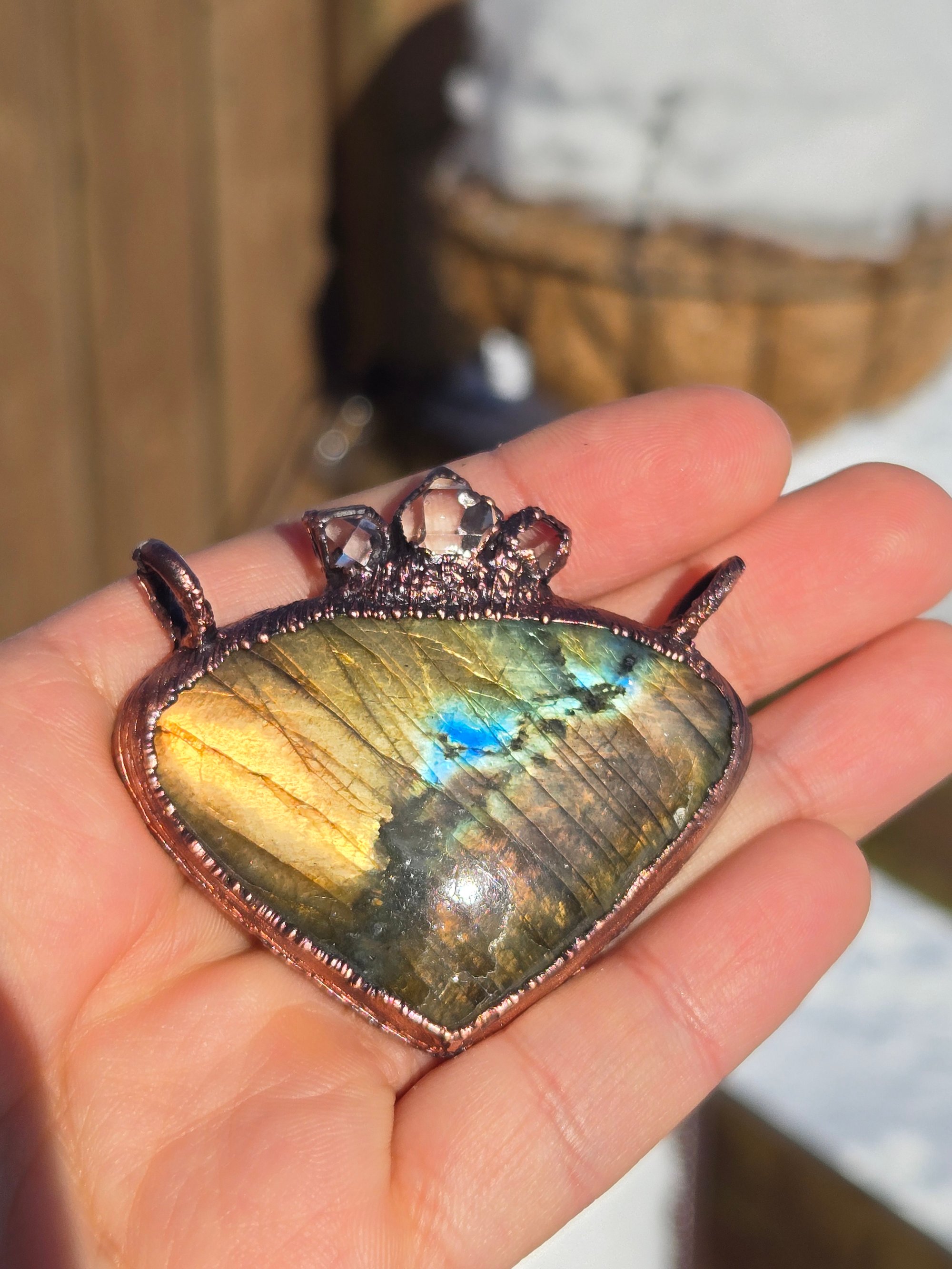 This enchanting copper electroformed pendant combines the mystical beauty of a flashy labradorite with the raw elegance of a Herkimer diamond.