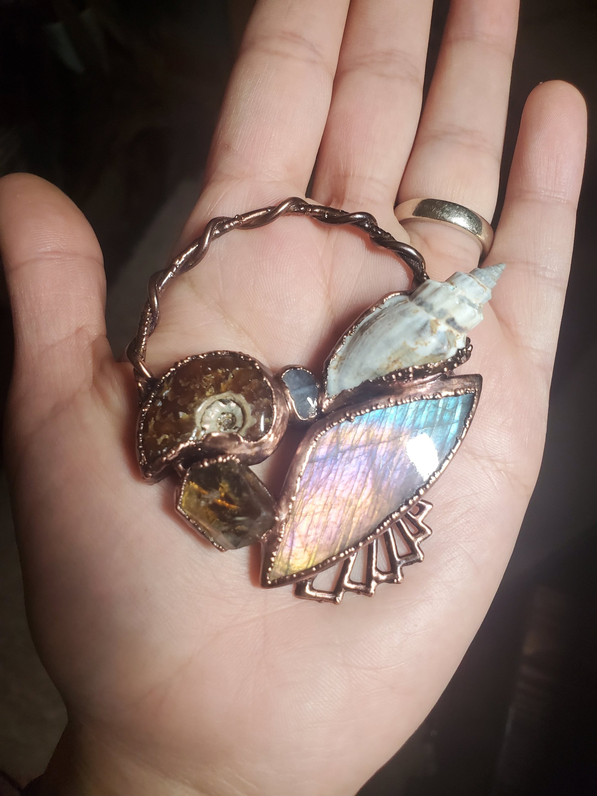 This gorgeous hand crafted Copper electroformed Amulet features a beautiful flashy Labradorite, citrine, ammonite, moonstone, and a natural shell. This beautiful Amulet will come with both a copper chain and a faux suede leather cord.