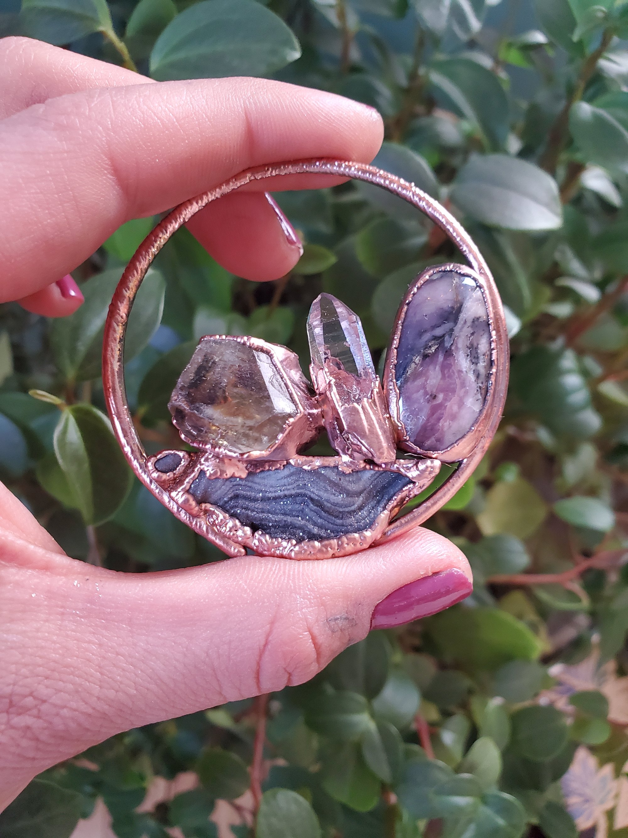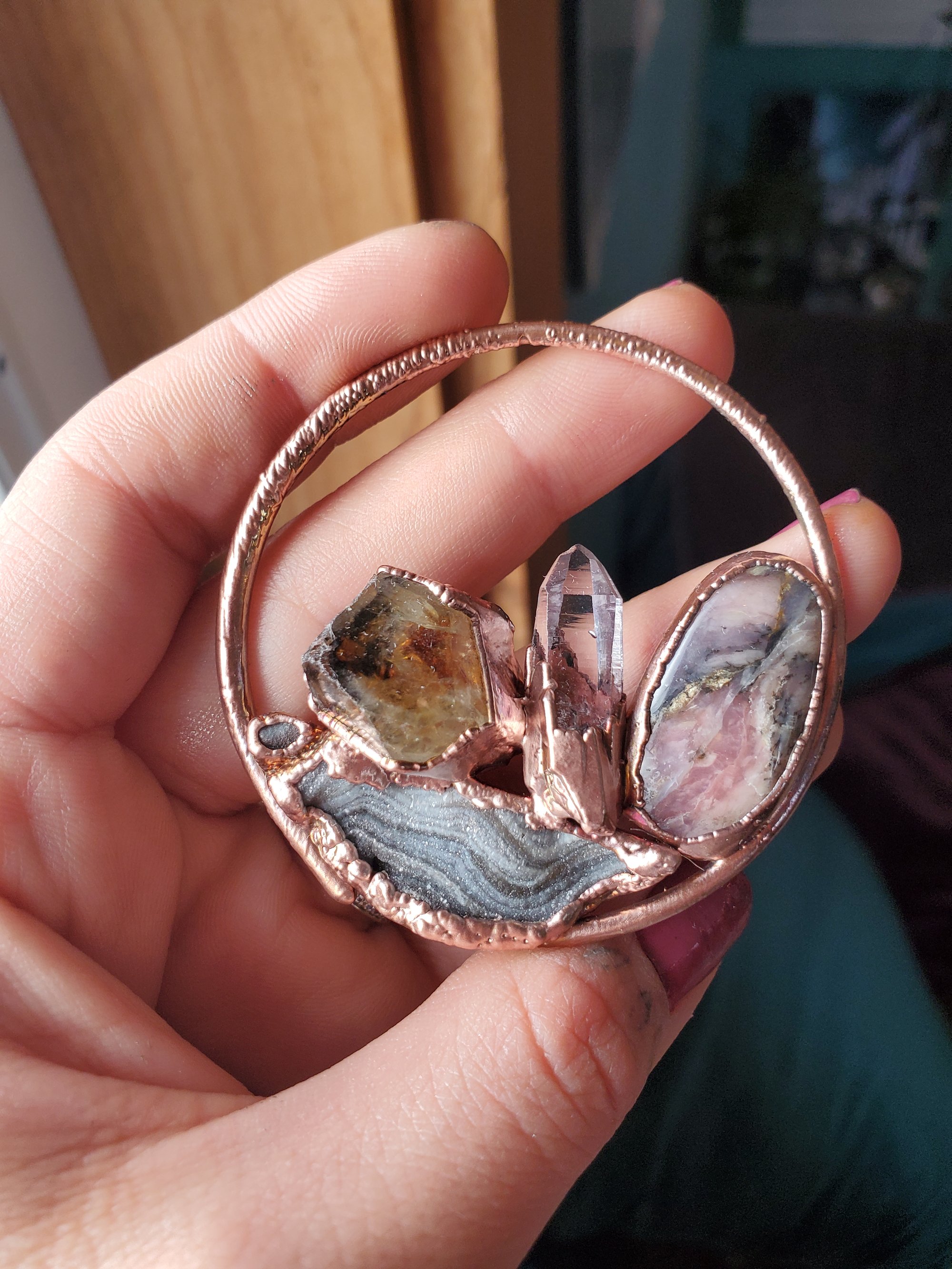This beautiful and powerful copper electroformed Amulet features pink opal, brizilian citrine, Vera Cruz Amethyst, and a druzy crystal.